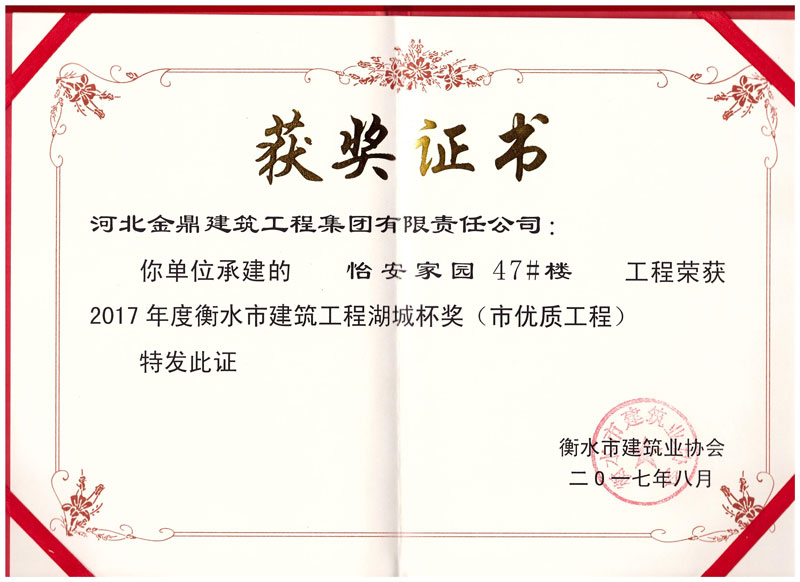 怡安家園47#樓工程榮獲2017年衡水市建筑工程湖城杯獎(市優質工程)